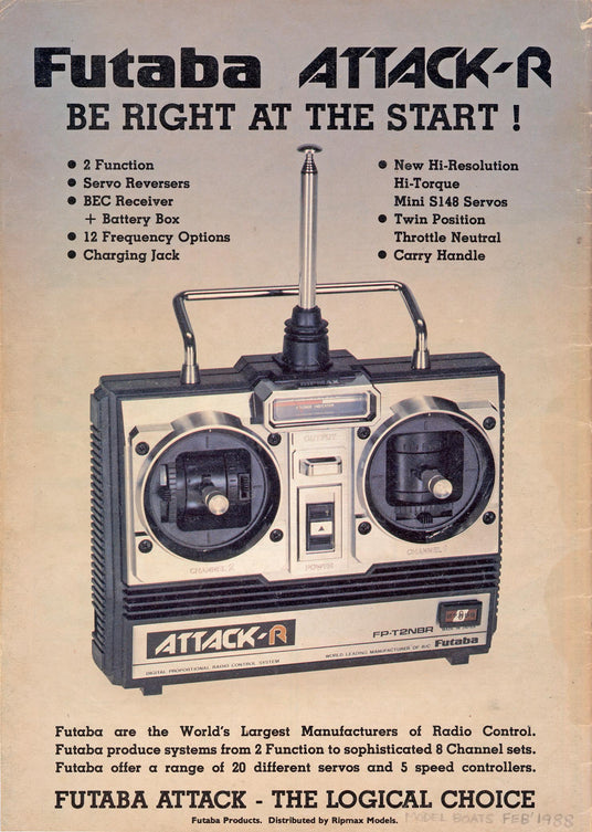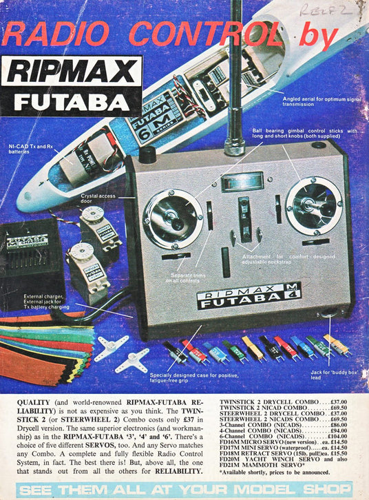 The first Futaba radio control products sold in the UK were single channel sets, these being imported and sold by Model Avionics, based in the Old Kent Road in London. It was not long before Digimax multi-channel sets were developed, and at this time the UK distribution of Futaba became shared between Model Avionics, who carried out all servicing and repairs, and Ripmax.